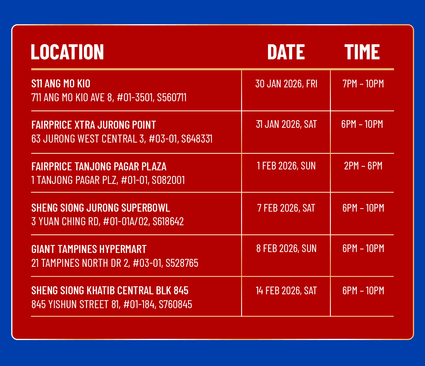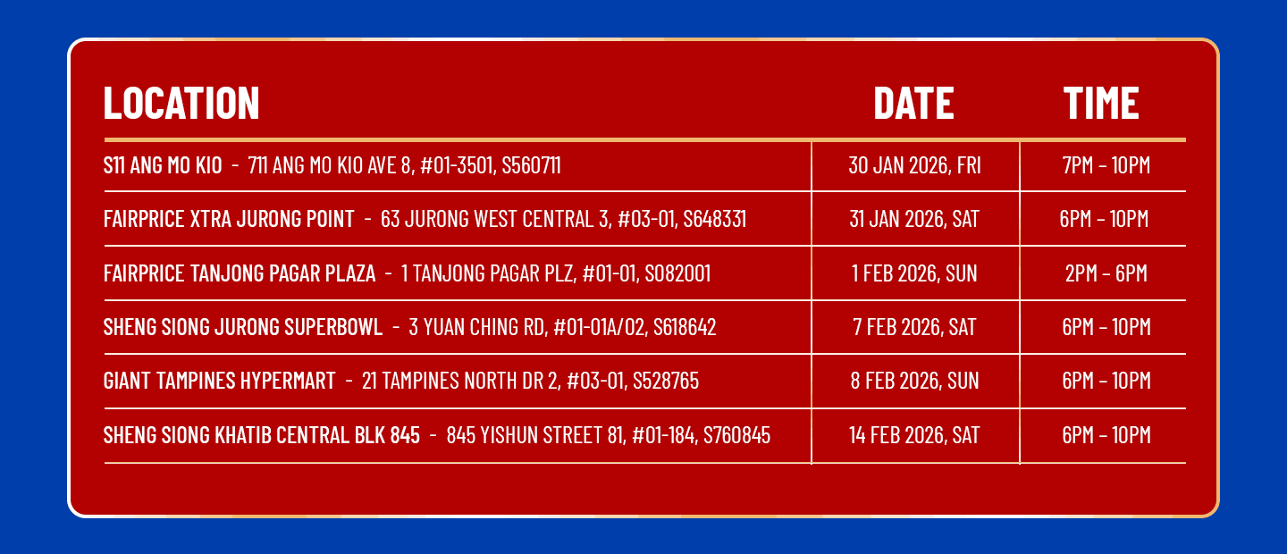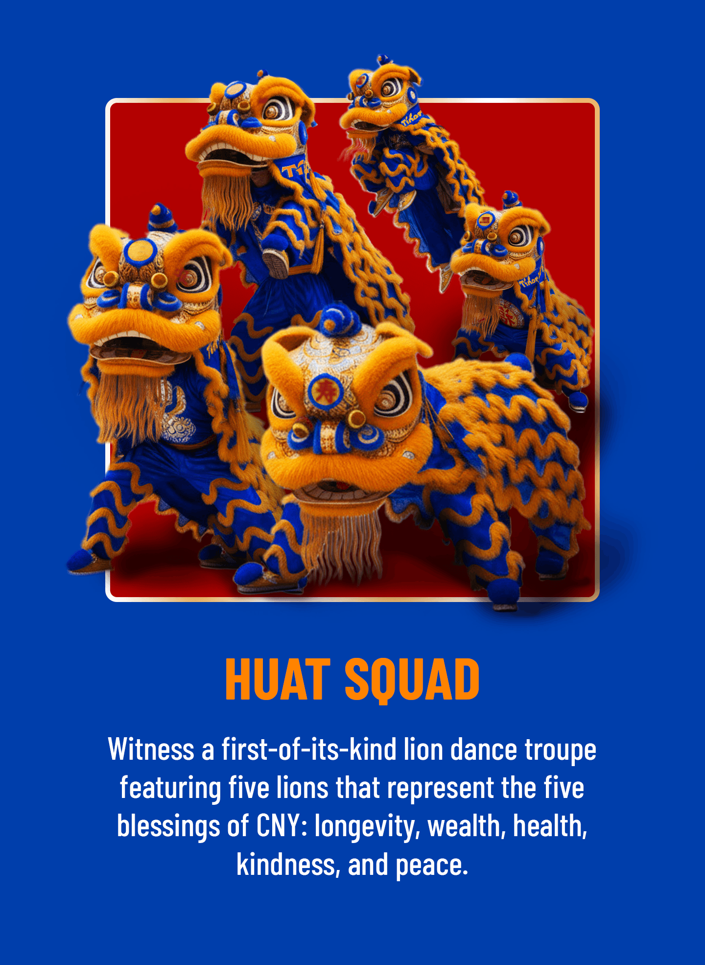 FROM 31 JANUARY TO 15 FEBRUARY, OUR FIVE-LION TROUPE WILL MAKE THEIR WAY TO SIX FESTIVE ROADSHOWS, BRINGING THE ROAR, CHEER, AND THE HUAT TO YOUR NEIGHBOURHOOD