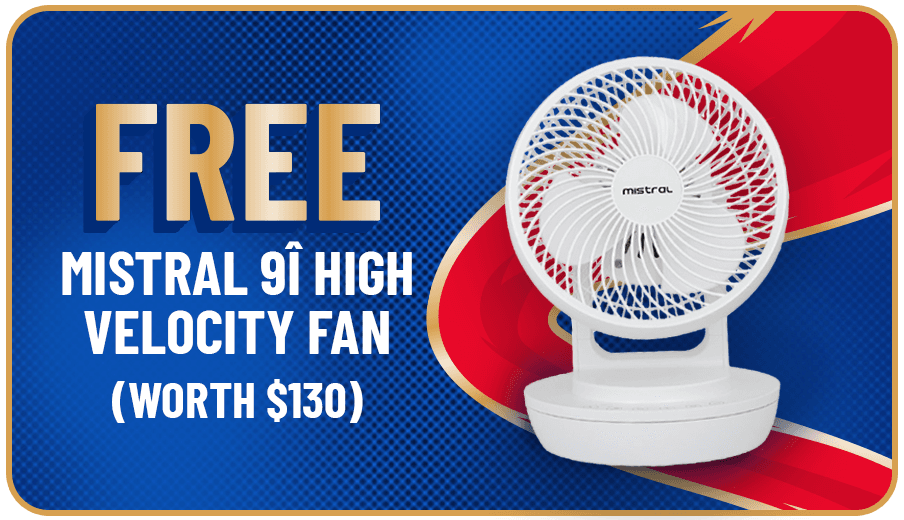 GET FREE MISTRAL 9I HIGH VELOCITY FAN WORTH $130 WITH MIN. PURCHASE OF 5 X 24S CARTONS ON PARTICIPATING BRANDS